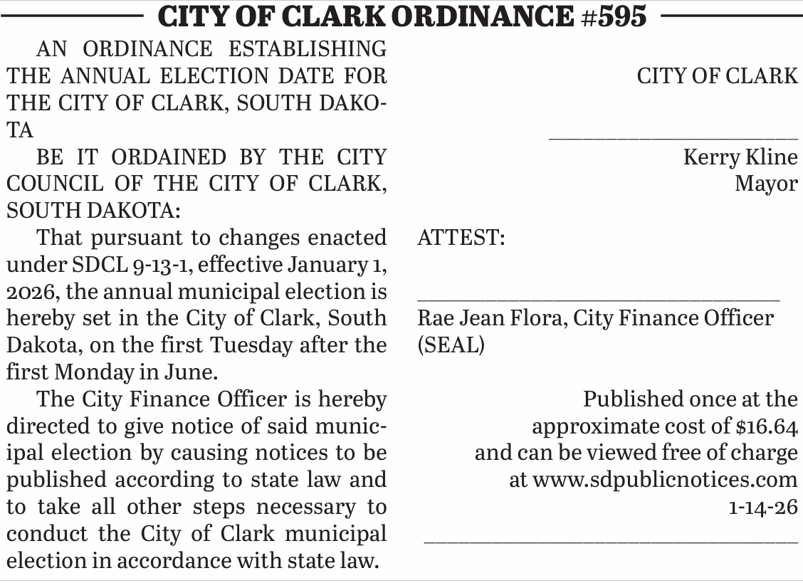 Posted inLegal Notices 1.14.26 City of Clark Ordinance #595January 15, 2026No CommentsPosted inLegal NoticesPost navigationPrevious Post 1.14.26 City of Clark Resolution Number 879Next PostJanuary 21, 2026 Clark County Courier