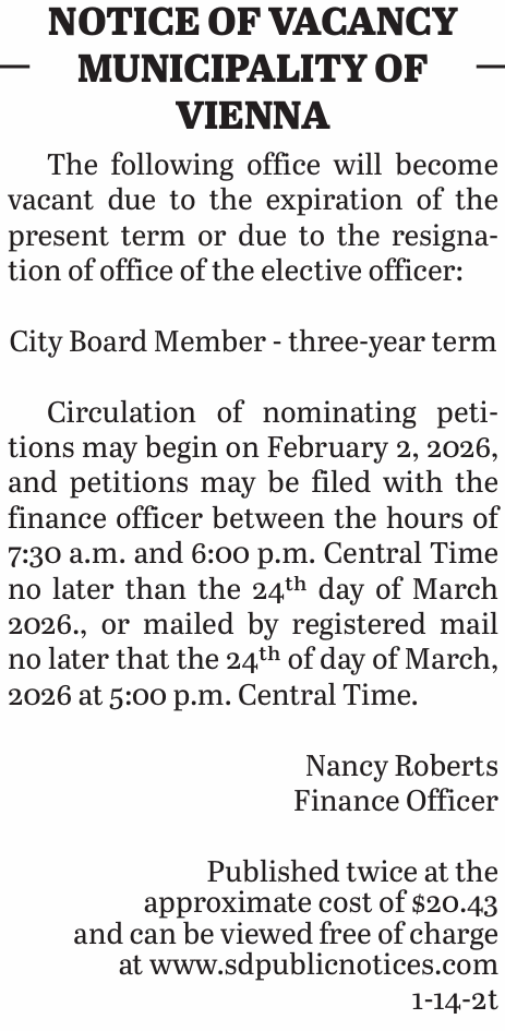 Posted inLegal Notices 1.14.26 Notice of Vacancy Municipality of ViennaJanuary 15, 2026No CommentsPosted inLegal NoticesPost navigationPrevious Post 1.14.26 Vienna Town Board January MinutesNext Post1.14.26 Notice of Leasing of Farmland City of Clark (3 Year Lease)