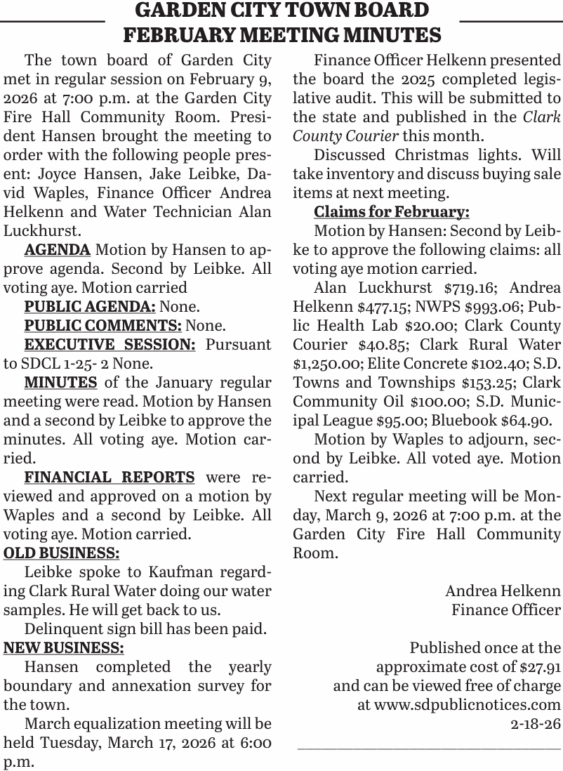 Posted inLegal Notices 2.18.26 Garden City Town Board February Meeting MinutesFebruary 19, 2026No CommentsPosted inLegal NoticesPost navigationPrevious Post 2.18.26 Municipality of Garden City Statement of Fund Cash Balances All Funds December 31, 2025Next Post2.18.26 Clark School Board approves hiring additional special ed teacher, admin, contracts