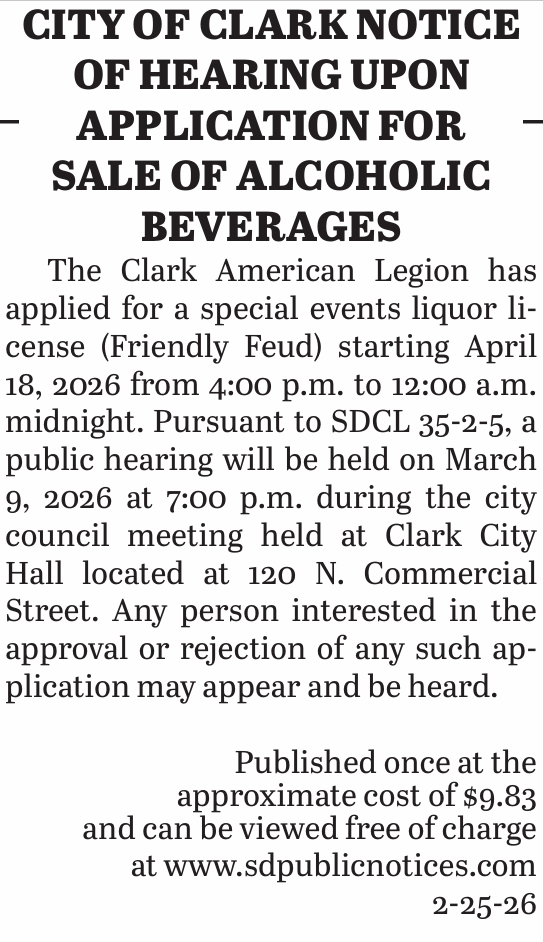 Posted inLegal Notices 2.25.26 City of Clark Notice of Hearing Upon Application for Sale of Alcoholic Beverages (Friendly Feud)February 26, 2026No CommentsPosted inLegal NoticesPost navigationPrevious Post 2.25.26 Notice to CreditorsNext Post2.25.26 City of Clark Notice of Hearing Upon Application for Sale of Alcoholic Beverages (Pro Pheasants)