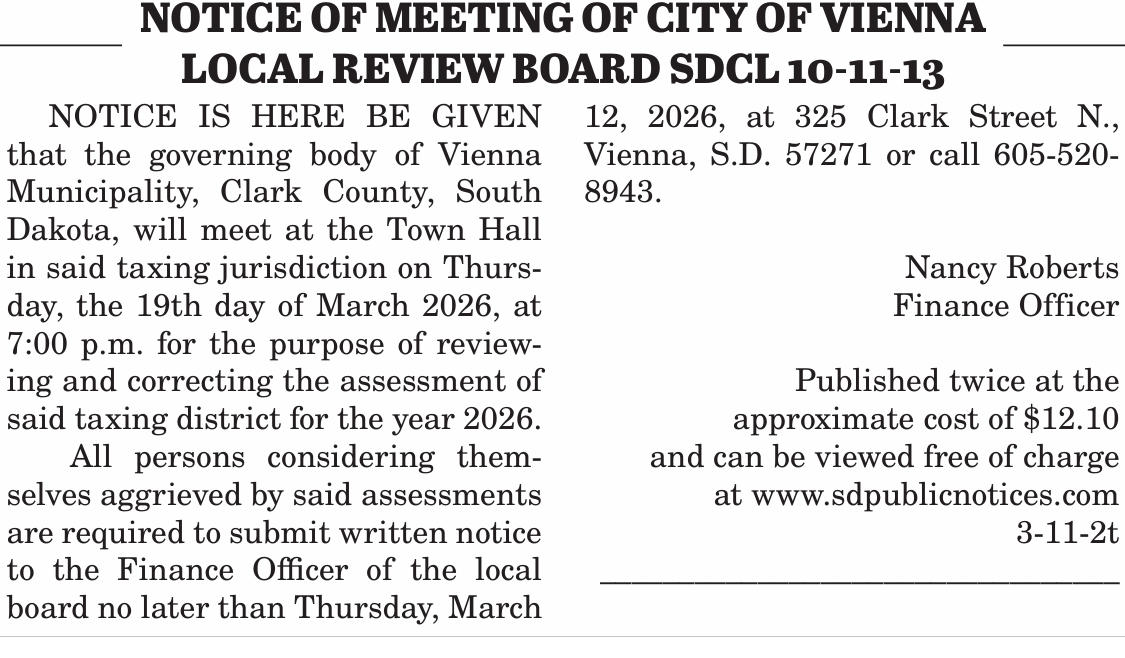 Posted inLegal Notices 3.11.26 Notice of Meeting of City of Vienna Local Review Board SDCL 10-11-13March 12, 2026No CommentsPosted inLegal NoticesPost navigationPrevious Post 3.11.26 Raymond Town Board Meeting March 2, 2026Next Post3.11.26 ATTN: City of Willow Lake Residents per Ordinance Number 22
