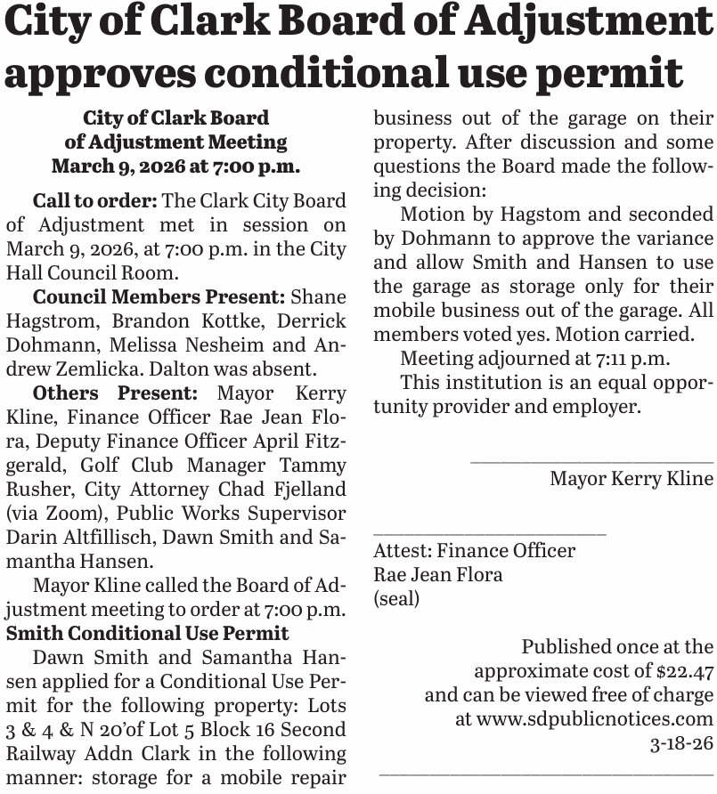 Posted inLegal Notices 3.18.26 City of Clark Board of Adjustment approves conditional use permitMarch 19, 2026No CommentsPosted inLegal NoticesPost navigationPrevious Post 3.18.26 Clark County Commissioners approve variance, conditional use permit at March 3 meetingNext Post3.18.26 March Clark City Council meeting entails pest control discussion