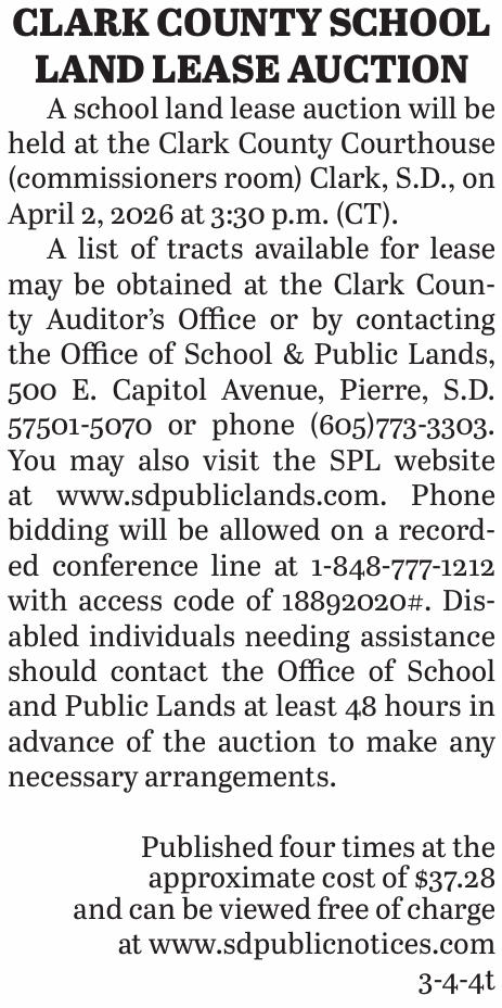 Posted inLegal Notices 3.4.26 Clark County School Land Lease AuctionMarch 5, 2026No CommentsPosted inLegal NoticesPost navigationPrevious Post 3.4.26 Notice of Meeting of City of Garden City Local Review Board SDCL 10-11-13Next Post3.4.26 Clark County Commissioners approve contingency transfer 2-25 of $9, 100 for Auditor budget
