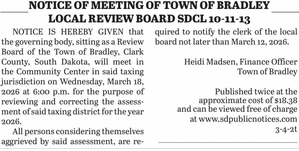 Posted inLegal Notices 3.4.26 Notice of Meeting of Town of Bradley Local Review Board SDCL 10-11-13March 5, 2026No CommentsPosted inLegal NoticesPost navigationPrevious Post 3.4.26 Annual Report for Clark County
