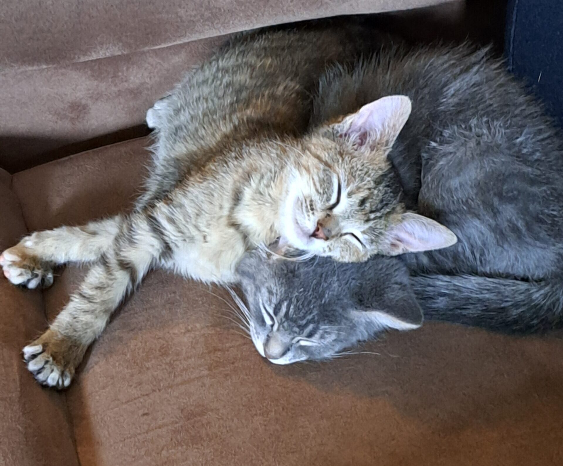 Zoey is a brown tabby cat (left). Her estimated birth date is August 15, 2025. She was found in a ditch as a tiny kitten and brought to the Humane Society in Watertown. She had to be fostered out and bottle-fed until she was big enough to go back to the Humane Society, which explains her big tummy. Her name before adoption was Sunny.