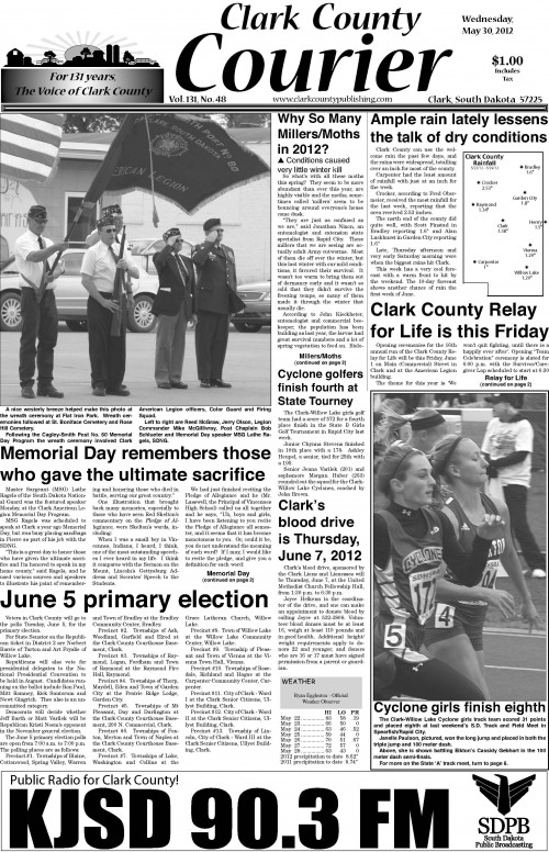 On the front is coverage of Memorial Day, a story on the large moth population this year and 2012 state track results.