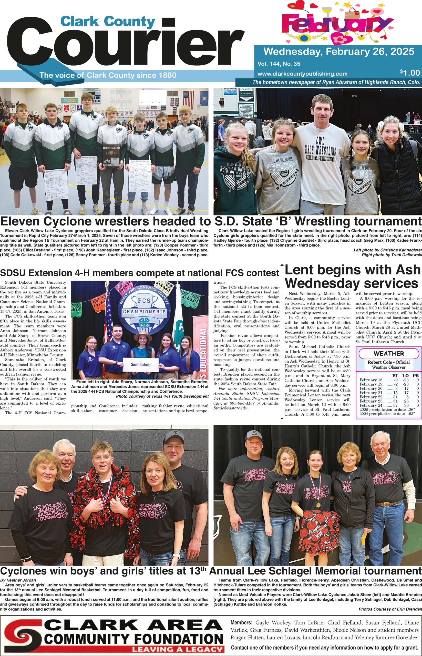 Posted inFront Page February 26, 2025 Clark Courier Front PageFebruary 25, 2025No CommentsPosted inFront PageClick here to download full editionPost navigationPrevious Post February 26, 2025 Clark County CourierNext PostDorothy Grimm