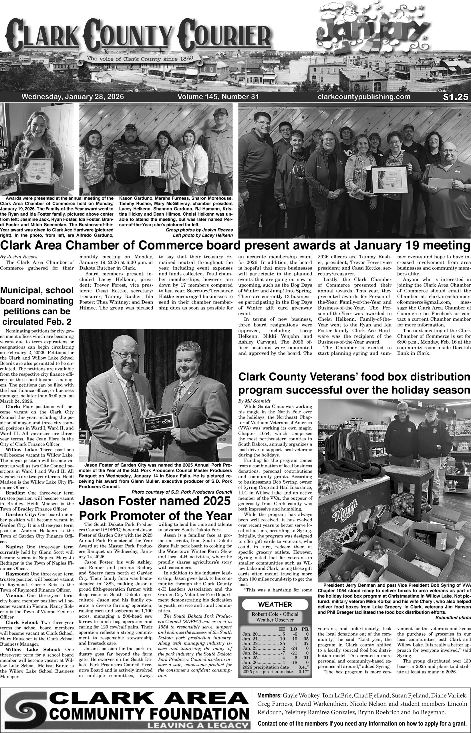 Posted inFront Page January 28, 2026 Clark Courier Front PageJanuary 27, 2026No CommentsPosted inFront PageClick here to view full edition with your subscriptionPost navigationPrevious Post January 28, 2026 Clark County CourierNext PostClark Area Chamber of Commerce board present awards at January 19 meeting
